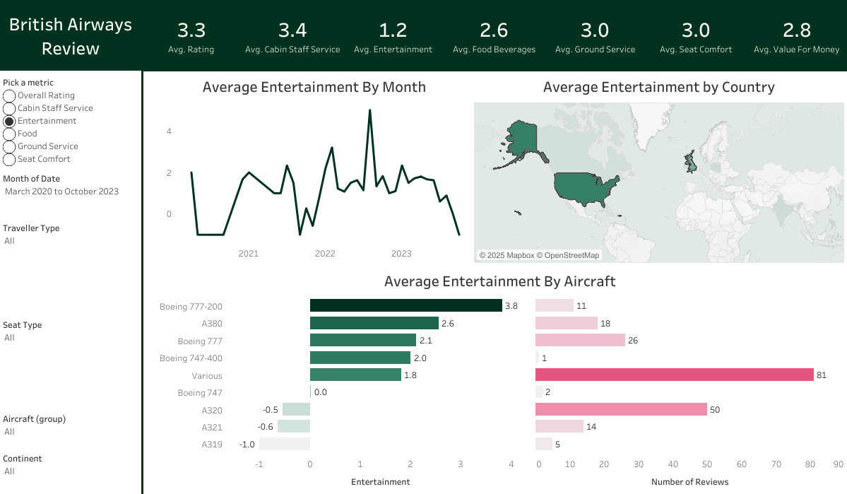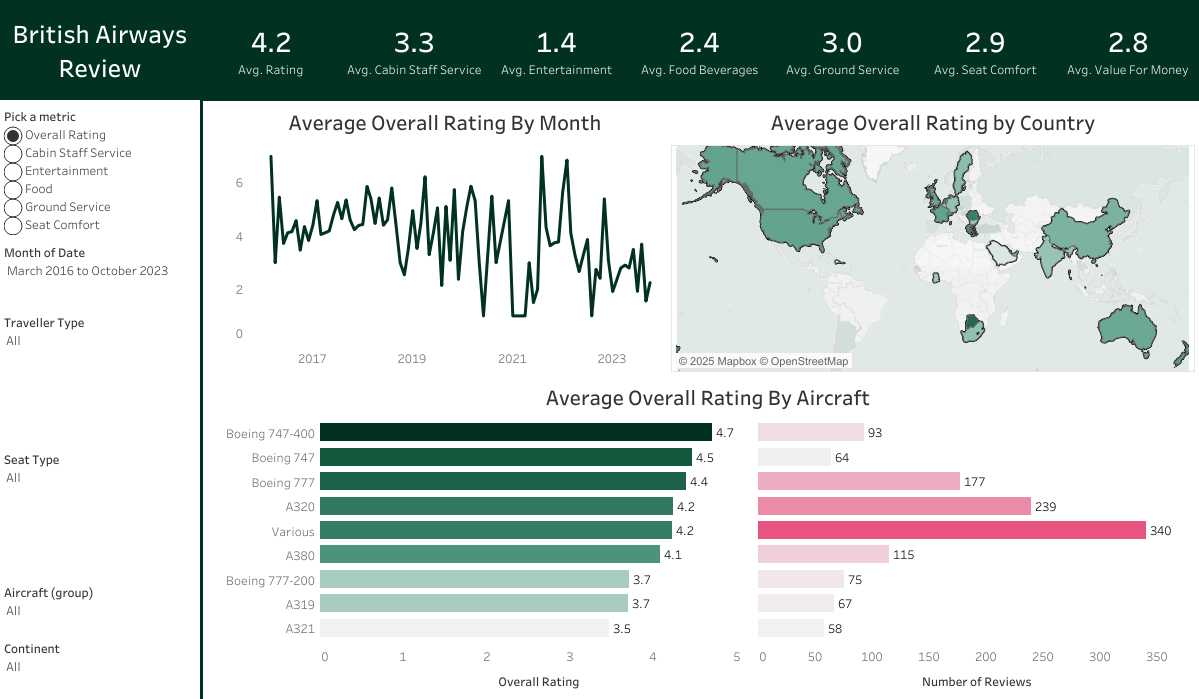 Created an interactive Tableau dashboard analyzing British Airways customer reviews across aircraft type, cabin class, country, and service categories to surface satisfaction drivers and pain points.