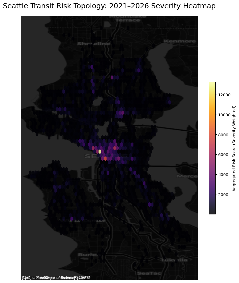 A weighted severity heatmap surfaces the downtown corridor as the dominant risk concentration, with 3rd Ave and Pike St emerging as the highest-severity node.
