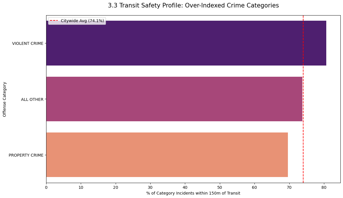 Violent crime is more concentrated near transit than the citywide average, which elevated priority scores for key downtown nodes.
