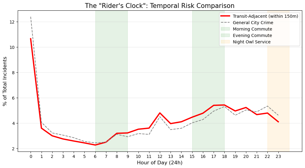 - Built temporal risk profiles to compare transit-adjacent incidents against broader city patterns and isolate commuter risk windows.