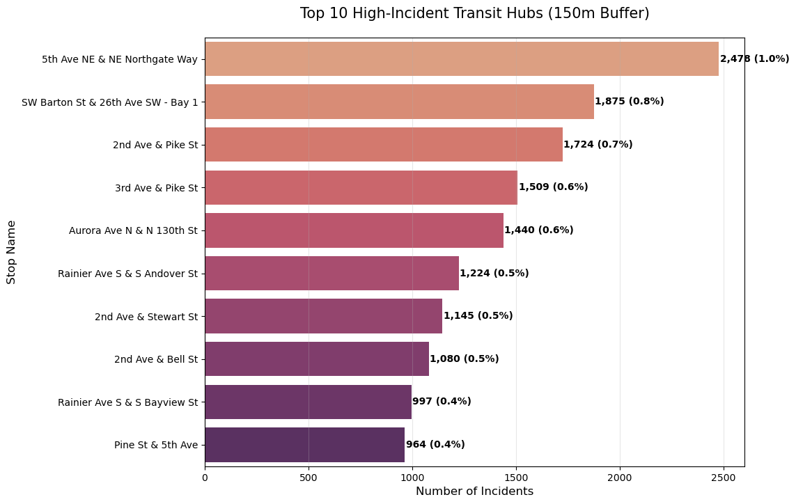 High-volume transit hubs reveal where a concentrated share of incidents occurs within walking distance of stops.