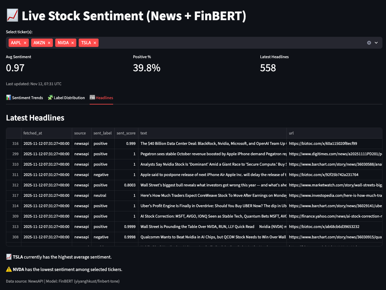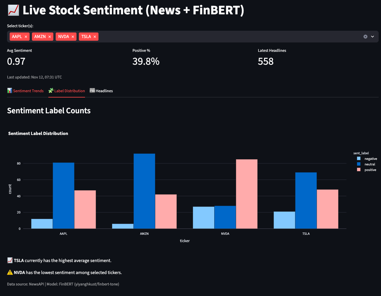 Developed a real-time sentiment analysis system using financial news data, classifying headlines by ticker and visualizing sentiment trends through a live dashboard.